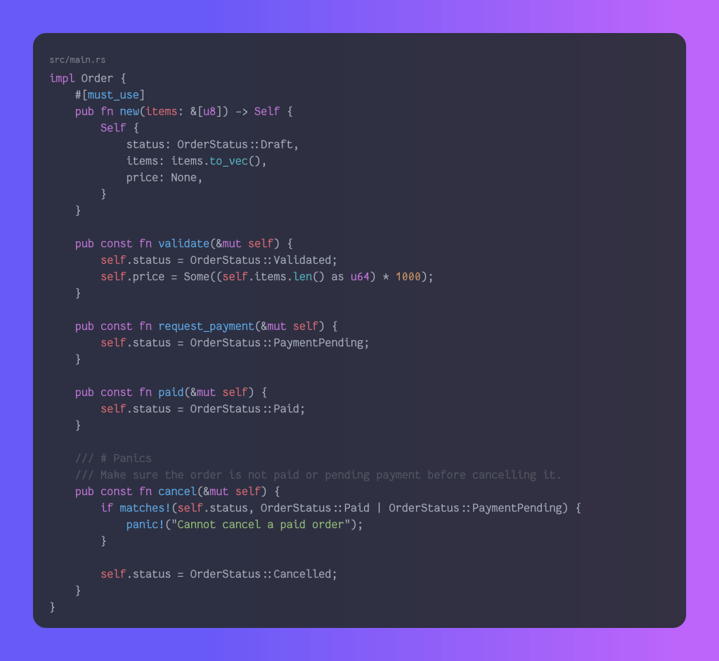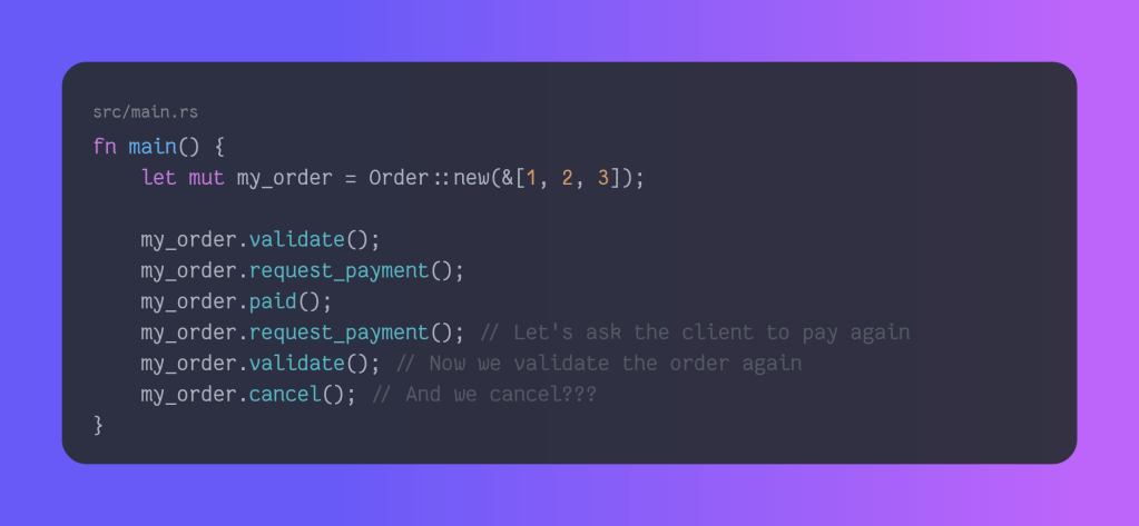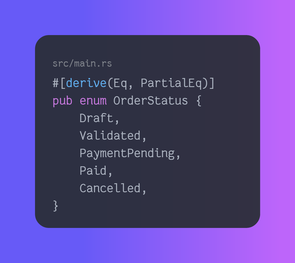 We have received requirements to build an order system. We should have the following states: draft, validated, payment pending, paid, and cancelled. Our clients have asked that we should not be able to cancel an order in payment, or if it was paid. Let’s get to work, first we’ll define our states as an enum, and create an Order struct to hold our data!