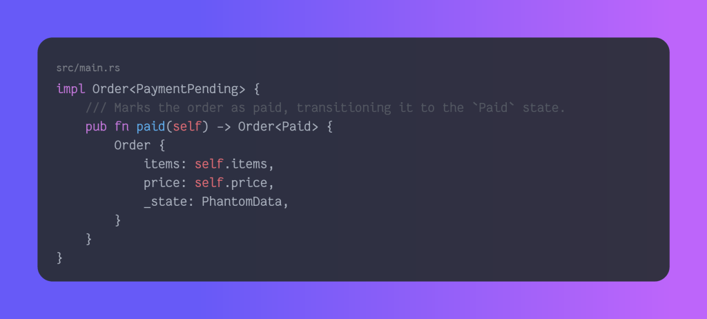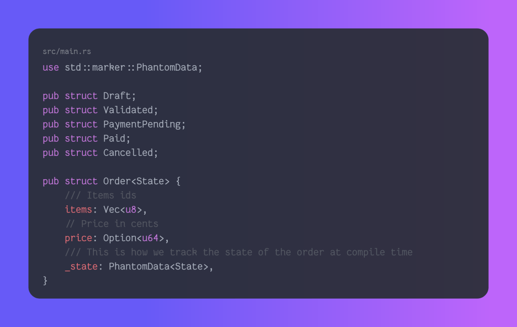 First we create our different states, and then we will create a struct order, which can act as an order of a given state. You can read more about PhantomData in the Rust documentation. The equivalent in Java would be to create an interface order and then extend it on draft, validated, payment pending, paid, and cancelled.