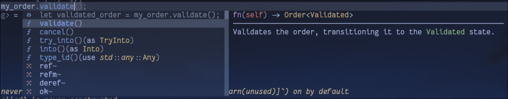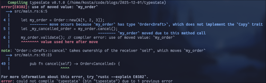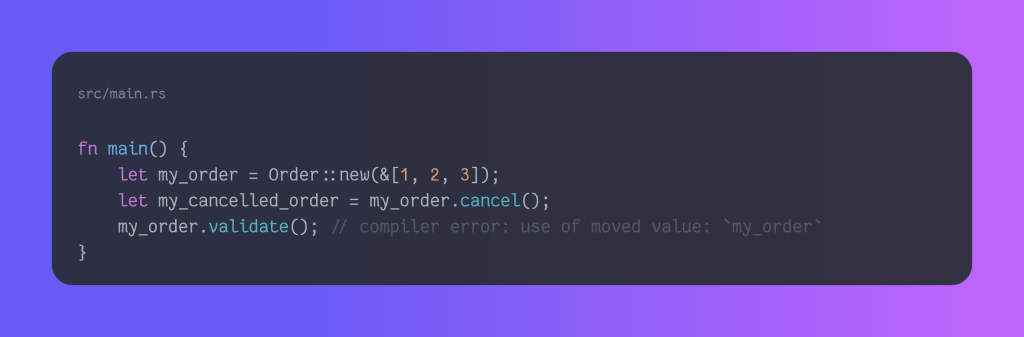 I would like to point out to the reader who is not familiar with Rust that the fn xxx(self) will take ownership, which is a Rust term meaning that the caller won’t be able to use the object anymore. This ensures us that once the order is cancelled, we won’t be able to use an old reference and validate it. Here is a demonstration.