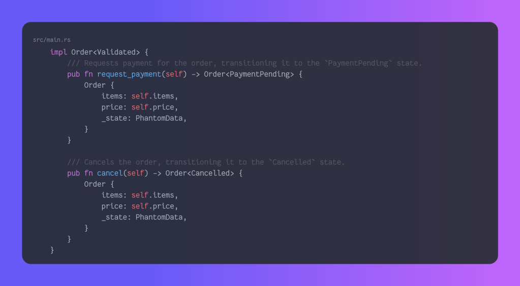 This is our draft state implementation. We allow the users to create a draft order, and we allow them to either validate, which here doesn’t do much but compute the price and, most importantly, returns an Order<Validated>. The other option is to cancel the order, which returns an Order<Cancelled>.